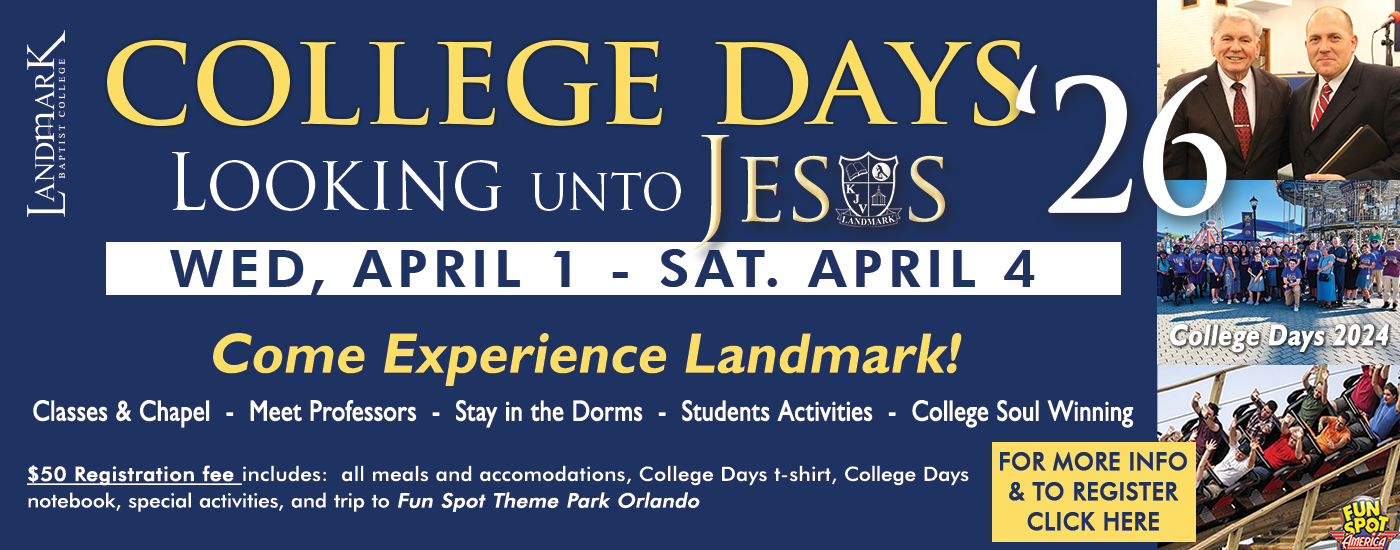Thank you for your consideration of Landmark Baptist College. We are thrilled that you have considered us for your Bible College training. I trust that the Lord will guide you in this very crucial decision. Landmark Baptist College has been operating for over 35 years. Our first emphasis here is the Holy Scripture. Some treat the Bible as a mystical book that is not practical and hard to be understood. I do not believe the Bible is beyond our understanding.